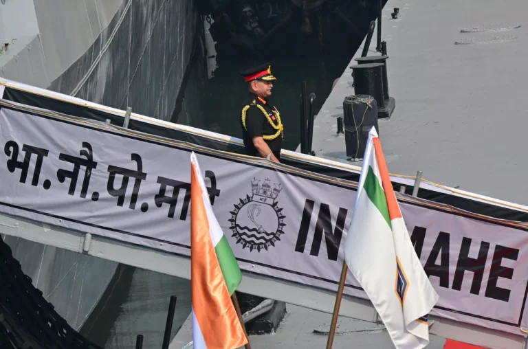 INS Mahe, the first Mahe-class Anti-Submarine Warfare Shallow Water Craft, is seen during its commissioning at the Naval Dockyard in Mumbai on Monday November 24, 2025 . It was commissioned by Indian Army Chief General Upendra Dwivedi Army Chief General…