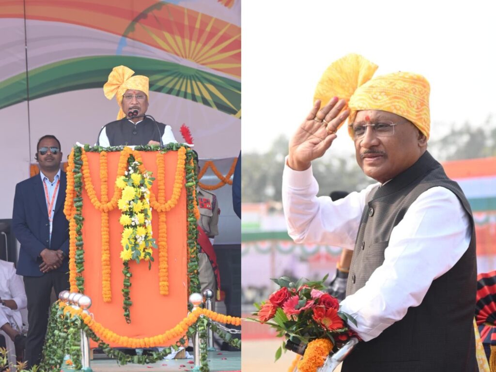 Chief Minister Vishnu Deo Sai hoisted the national flag and took the salute at the main Republic Day ceremony held at the Police Parade Ground in Bilaspur. He honored the families of martyred soldiers and police personnel and announced the award of a medal to the Chhattisgarh Police Force on the 25th anniversary of the state’s formation.