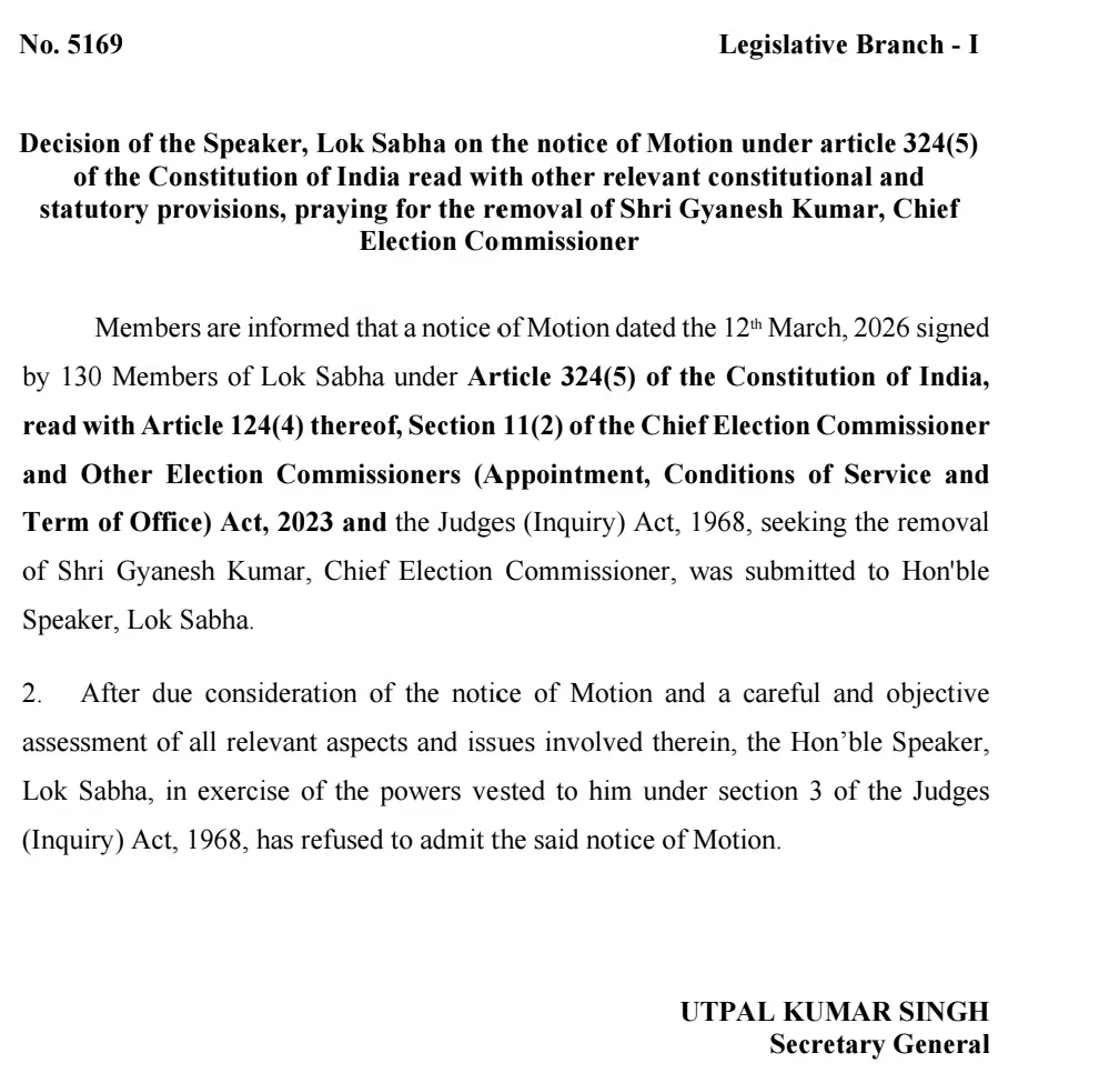 Providing information, Lok Sabha Secretary-General Utpal Kumar Singh stated that this decision was taken pursuant to a notice of motion submitted under Article 324(5) of the Constitution of India. This motion sought the removal of Chief Election Commissioner Gyanesh Kumar. Members are hereby informed that a notice of motion, dated March 12, 2026, was received.